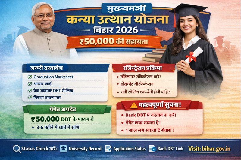 Mukhyamantri Kanya Utthan Yojana बिहार सरकार की एक महत्वपूर्ण योजना है, जिसके अंतर्गत योग्य छात्राओं को ₹50,000 की आर्थिक सहायता प्रदान की जाती है। यह राशि छात्राओं को उच्च शिक्षा के लिए प्रोत्साहित करने हेतु दी जाती है। नीचे इस योजना से जुड़ी लेटेस्ट 2026 अपडेट, रजिस्ट्रेशन प्रक्रिया, जरूरी दस्तावेज और भुगतान से जुड़ी पूरी जानकारी दी गई है।